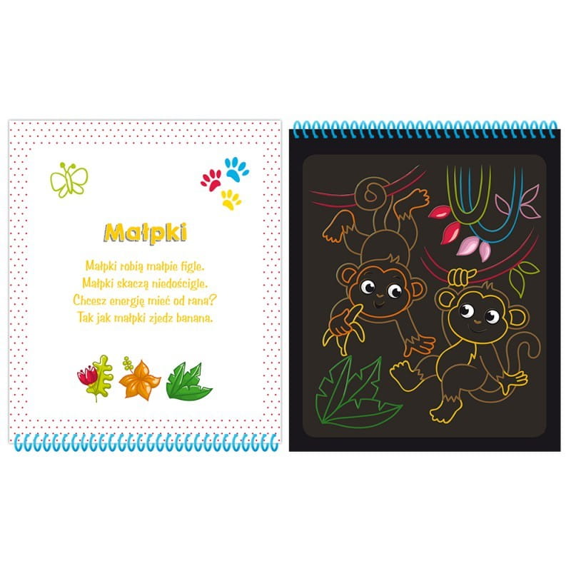 Notes na kołowrotku pełen arkuszy wydrapywanek ze zwierzakami oraz krótkimi wierszykami o zwierzętach. Czarne karty zdrapki kryją pod spodem kreatywne obrazy do zdrapania. Zadanie polega na zdrapaniu wosku załączonym rysikiem z zaznaczonych miejsc na kartach. Stopniowo odsłoni się kolorowe tło. Zdrapywanki są kolorowe, błyszczące i stanowią piękną ozdobę.