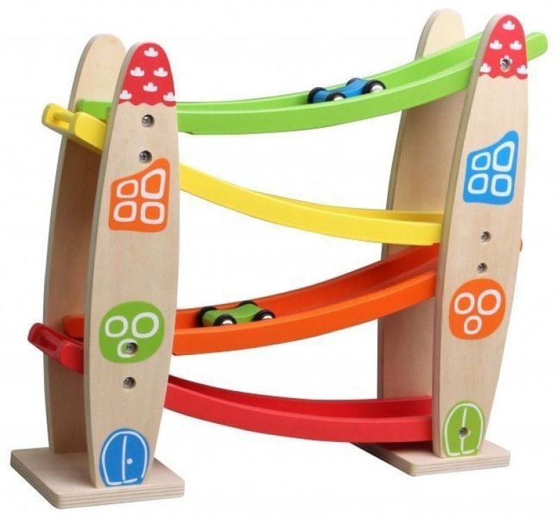 Drewniana zjeżdżalnia dla samochodzików to wspaniała zabawka dziecięca, pobudzająca różne zmysły i zdolności. Trzy kolorowe autka suną po zjeździe mając do pokonania cztery piętra. Puszczanie samochodzików w dół oraz obserwowanie ich prędkości to bardzo absorbujące zajęcie dla małych dzieci.
