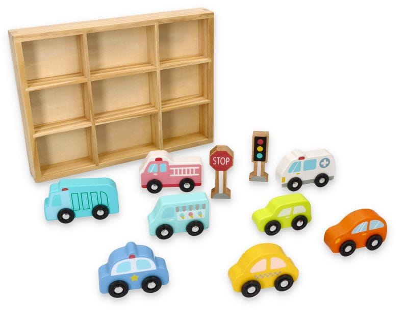 Po skończonej zabawie dziecko może schować wszystkie samochody do „ garażu” w formie drewnianego pudełka, które zostało dołączone do zestawu. W każdej przegródce można umieścić tylko jedno autko dzięki czemu dziecko uczy się dokładności oraz zachowania porządku.