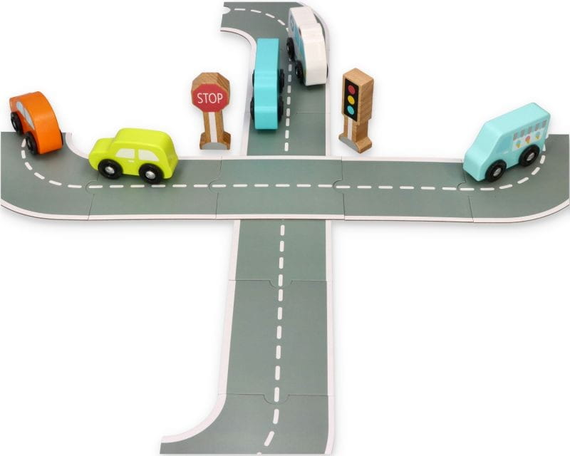 Drewniane pojazdy ze znakami drogowymi oraz skrzynką, która może posłużyć do zabawy w parkowanie i przechowywanie samochodzików.