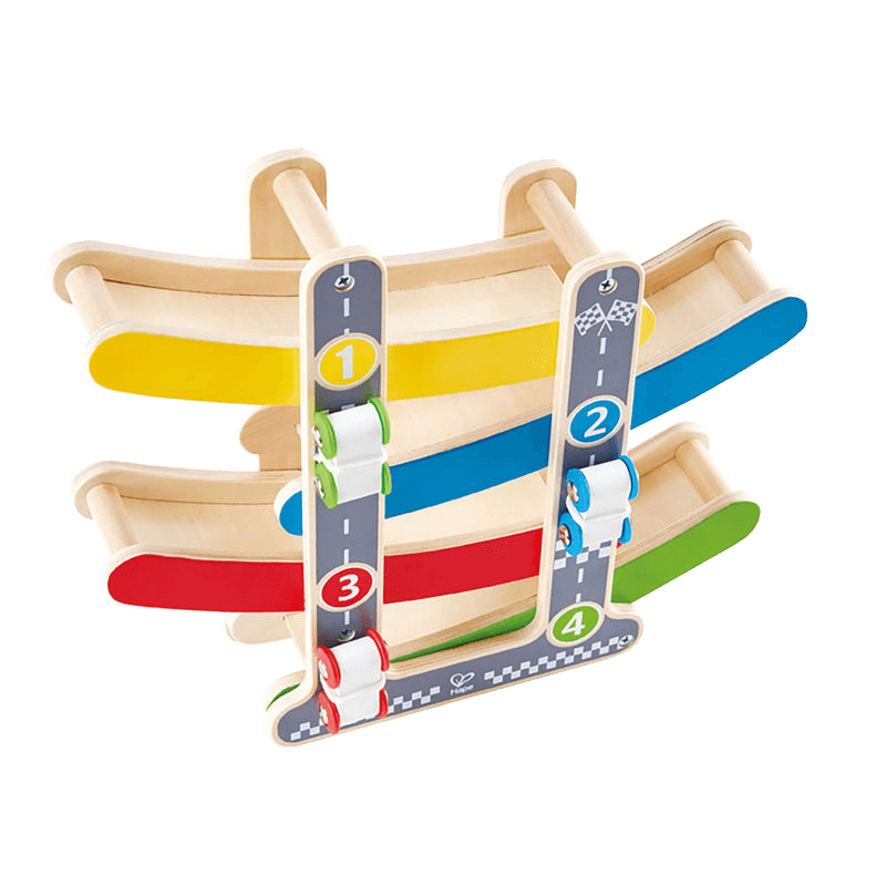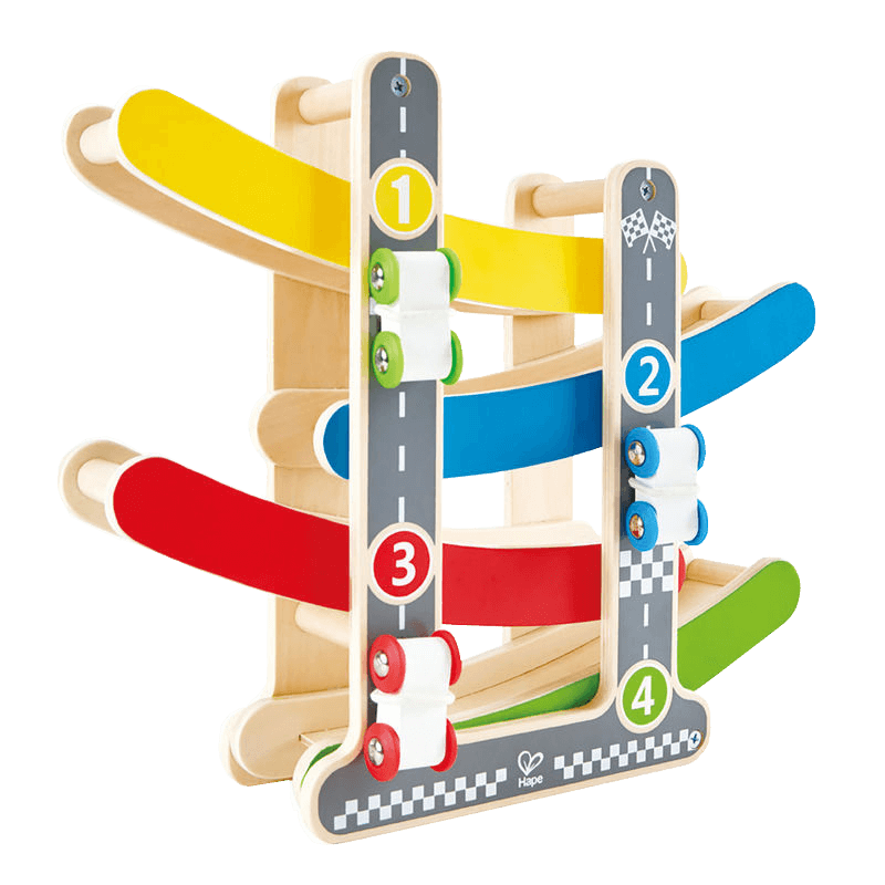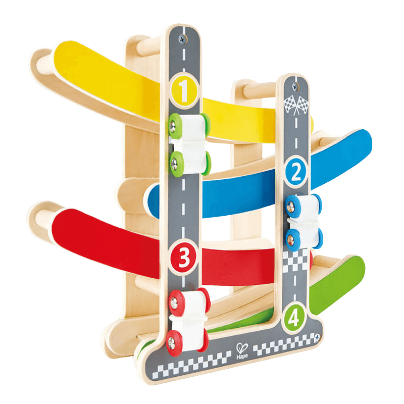 Drewniana zjeżdżalnia dla samochodzików to wspaniała zabawka dziecięca, pobudzająca różne zmysły i zdolności. Trzy kolorowe autka suną po zjeździe mając do pokonania cztery piętra. Puszczanie samochodzików w dół oraz obserwowanie ich prędkości to bardzo absorbujące zajęcie dla małych dzieci.