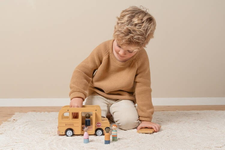 Szkolny autobus FSC od Little Dutch. Czy wszystkie dzieci siedzą? Gdy kierowca uruchomi silnik, możesz wyruszyć w podróż pełną radości. Niezależnie od tego, czy poruszasz się po wymyślonych krajobrazach miejskich, czy zabierasz wyimaginowanych pasażerów, ten drewniany pojazd pojedzie, dokądkolwiek chcesz. Gładko toczące się koła pozwalają Twojemu maluchowi bez wysiłku jeździć po podłodze, zabierając przyjaciół z każdego zakątka pokoju. Drzwi i dach drewnianego autobusu szkolnego można otwierać, a figurki pasują do domku dla lalek i innych zestawów do zabawy, takich jak samolot i samochód z przyczepą kempingową. Pozwól swojemu maluchowi cieszyć się podróżą dzięki temu wszechstronnemu drewnianemu zestawowi zabawek. Stanowi świetny pomysł na prezent i doskonałe uzupełnienie dla pozostałych zabawek z kolekcji Little Farm od Little Dutch.