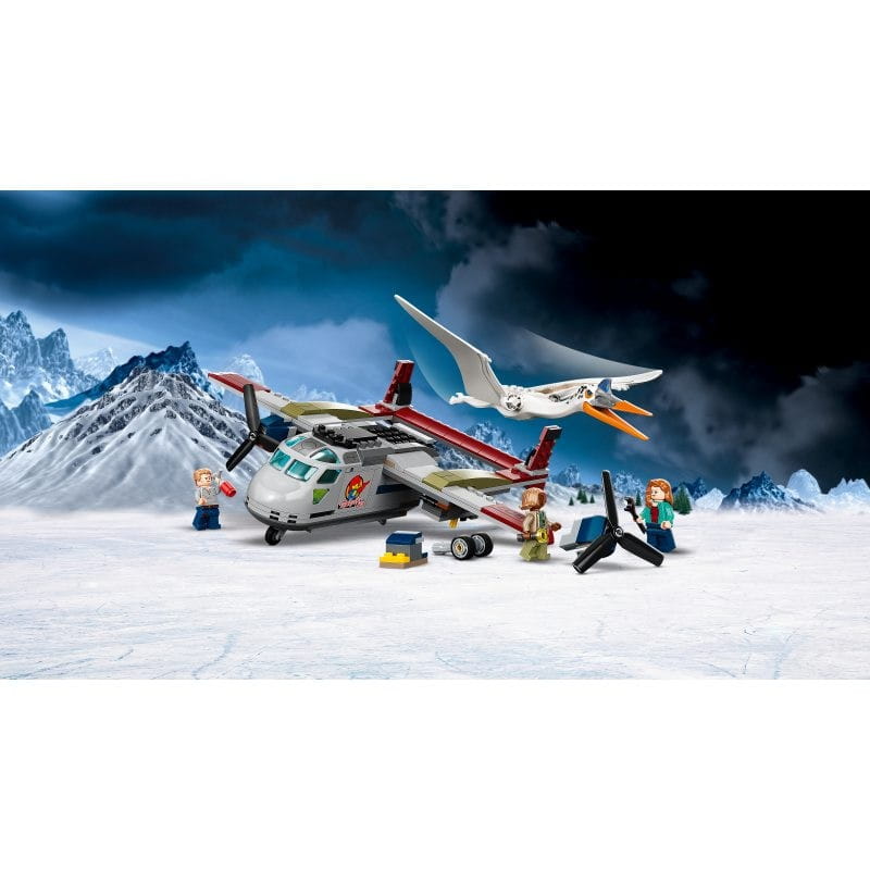 Trzy minifigurki i figurka pterozaura — zestaw zawiera minifigurki Owena Grady’ego, Claire Dearing i Kayli Watts. Kecalkoatl ma ok. 29 cm szerokości, ruchome skrzydła i otwierany dziób