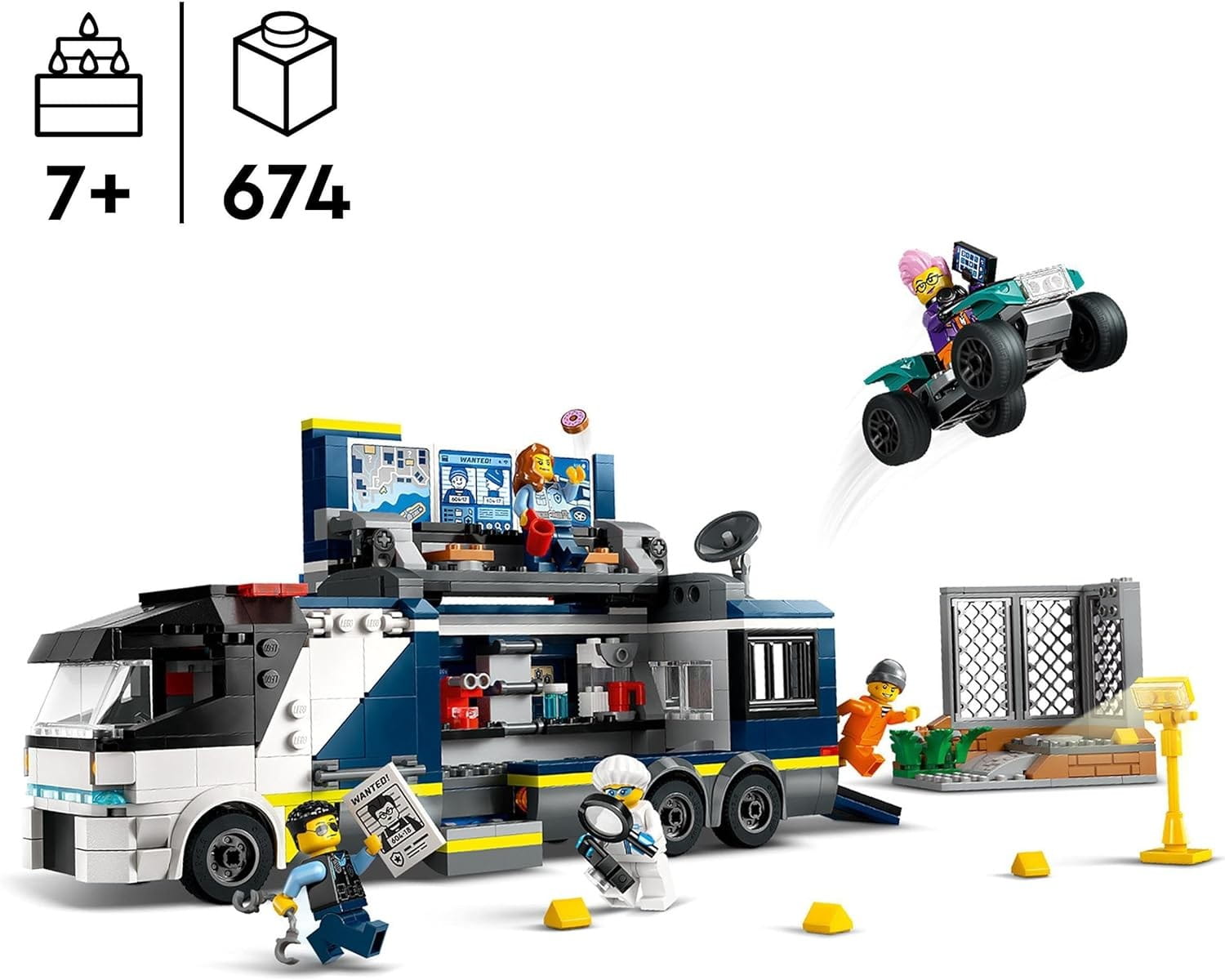 Zawiera plakat z listem gończym — za zgodą osobydorosłej dzieci mogą zeskanować kod QR znajdujący się w instrukcji budowania lub na pudełku, aby obejrzeć zabawny film z policjantami z LEGO® City
