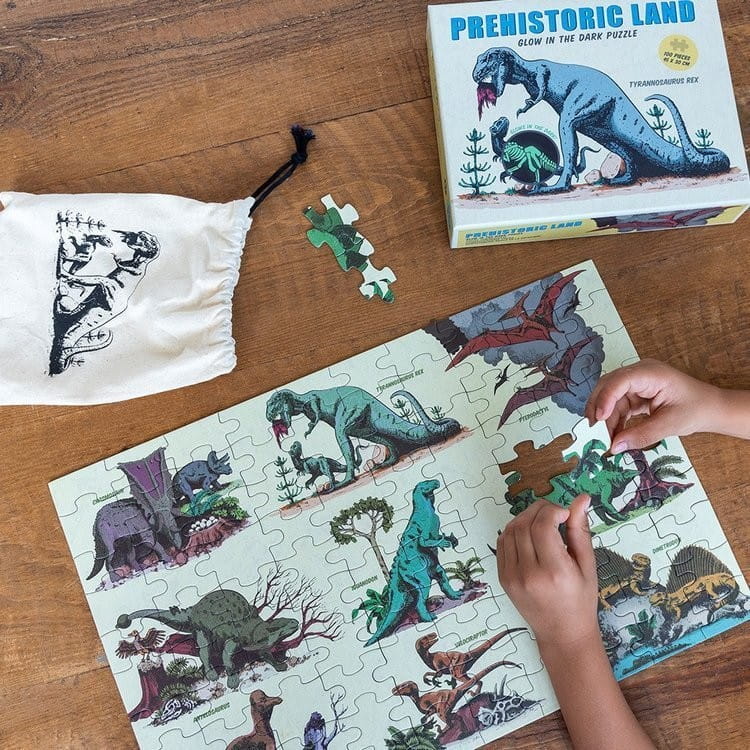 Puzzle świecące w ciemności Prehistoric Land Rex London przedstawiają 9 dinozaurów m.in. pterodaktyl, tyranozaury, chasmozaur, Iguanodon, Stegosaurus. Układanie 100 elementów jest świetnym treningiem dla mózgu, a powstałe wizerunki pradawnych gadów świecą w ciemności ukazując ich szkielet. Dzięki fluorescencyjnej grafice zabawa nie kończy się tylko na samym ułożeniu. W zestawie otrzymamy bawełniany woreczek, który ułatwia przechowywanie elementów. Podpowiedz do ułożenia obrazka znajduje się wewnątrz opakowania.