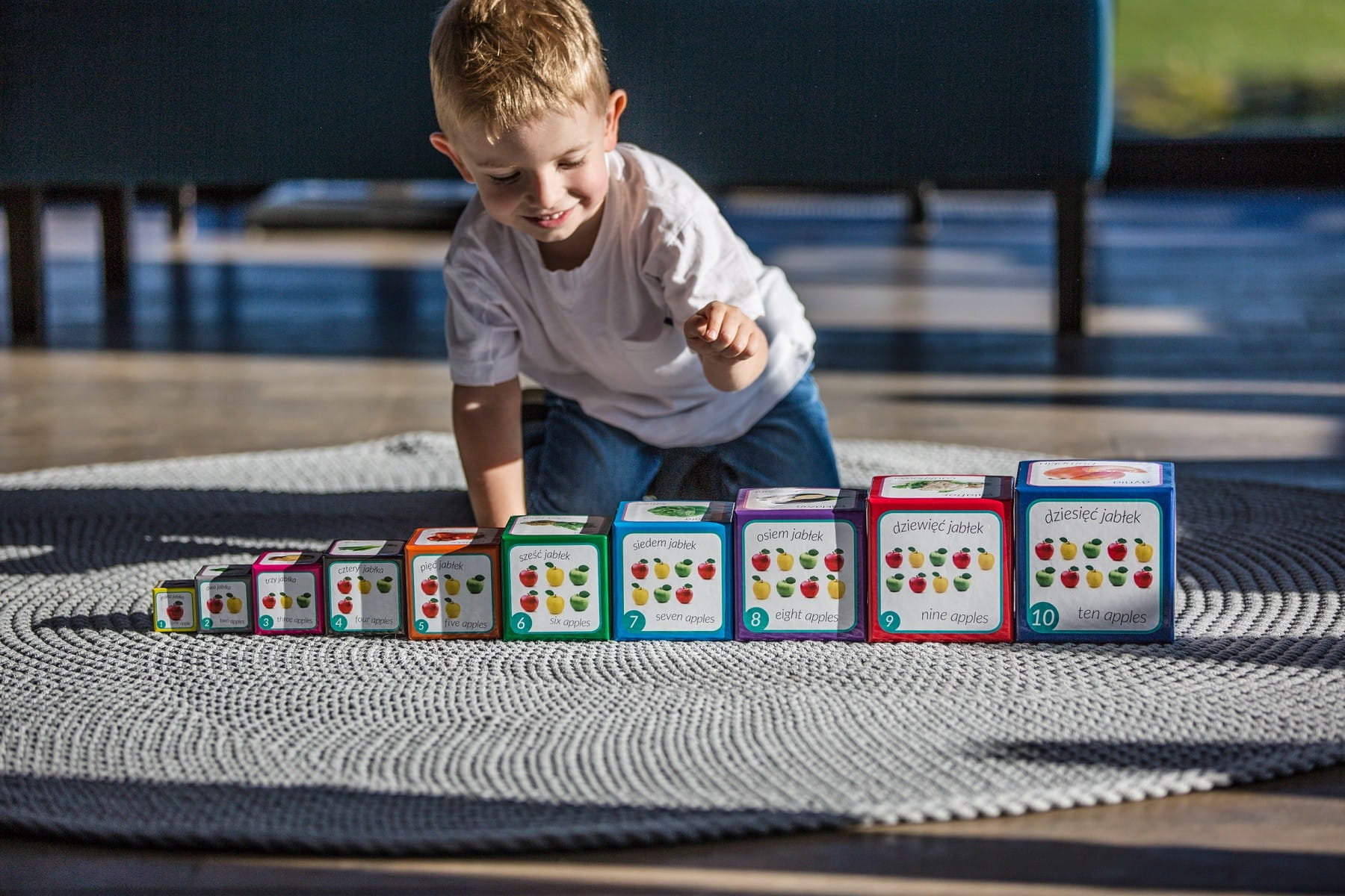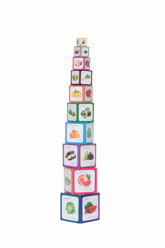 Piramida zabaw to 80 cm wieża składająca się z 10 kartonowych klocków, z realnymi zdjęciami owoców i warzyw, kolorami i cyframi. Nazwy są napisane w 2 językach: po polsku i angielsku, kolory żywe, wyraźne. Na każdym etapie rozwoju dziecka pojawiają sie nowe możliwości zabawy piramidą. Dla małych dzieci juz samo układanie i burzenie wysokich konstrukcji jest atrakcją. Następnie dzieci poznają 40 nazw warzyw i owoców, kolory, wygląd cyfr. Wraz ze zrostem dziecka, pojawiają się kolejne zastosowania do nauki i zabawy. Ta układanka wspiera rozwój mowy, zachęca do wymieniania i wyliczania, wskazywania paluszkiem. Cyfry oraz ich przedstawienie graficzne wspomagają poznawanie rzędu wielkości i naukę liczenia do 10. Dziecko poznają określenia duży mały, większy mniejszy. Pudełko mogą służyć też do sortowania, układania, chowania, gry w zakrywane memo itp.