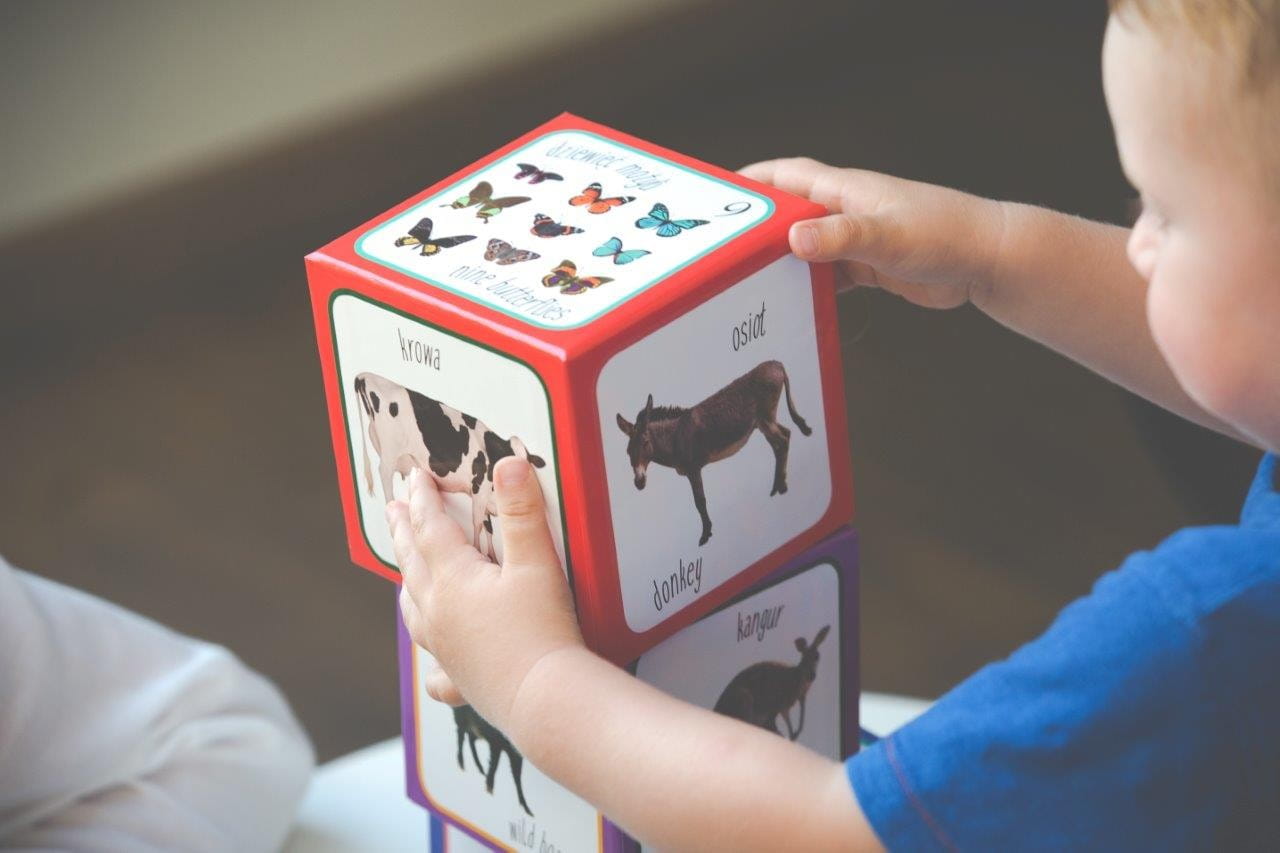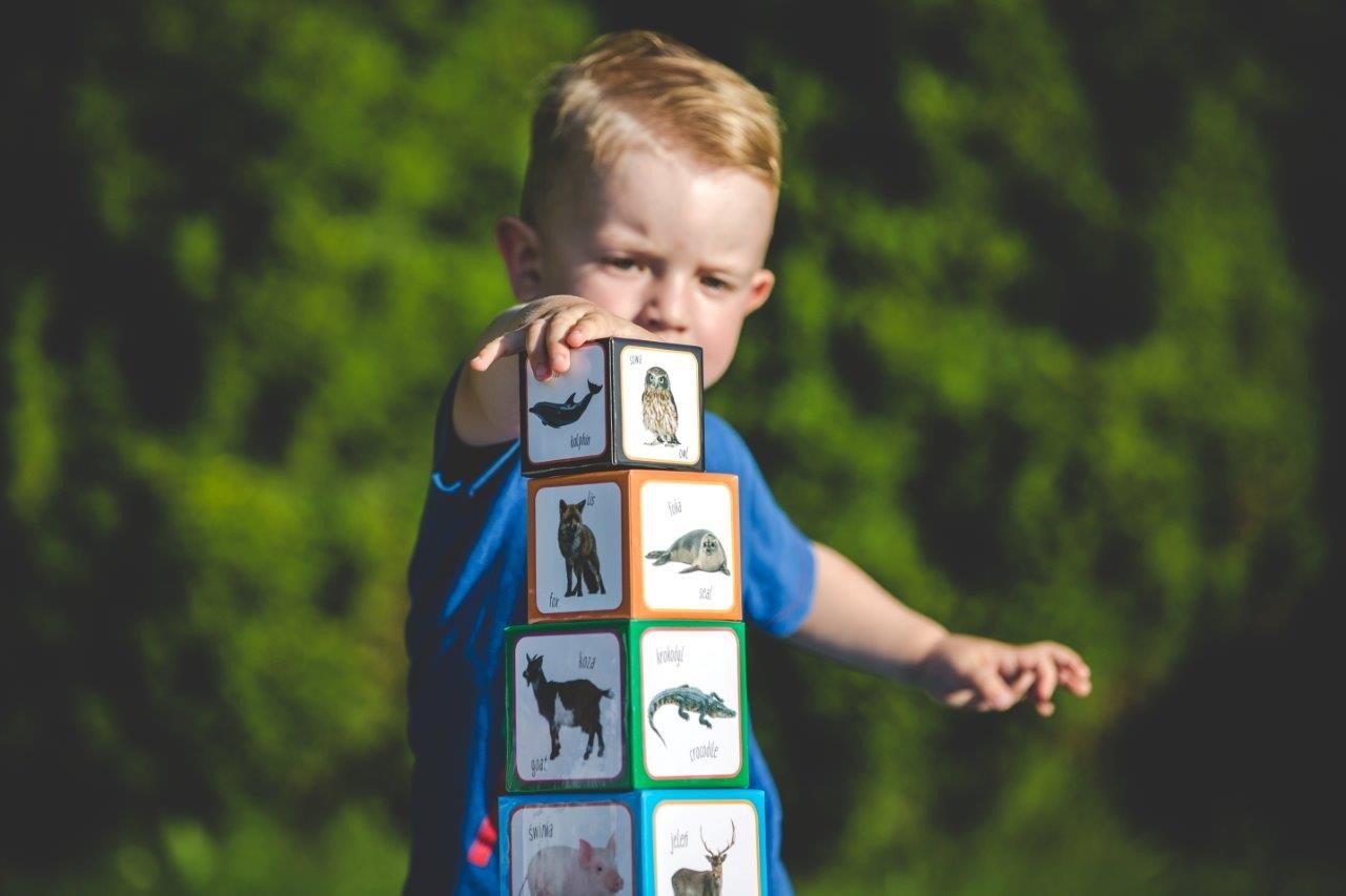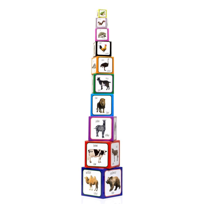 Piramida zabaw to 80 cm wieża składająca się z 10 kartonowych klocków, z realnymi zdjęciami zwierząt, kolorami i cyframi. Nazwy są napisane w 2 językach: po polsku i angielsku, kolory żywe, wyraźne. Na każdym etapie rozwoju dziecka pojawiają się nowe możliwości zabawy piramidą. Dla małych dzieci już samo układanie i burzenie wysokich konstrukcji jest atrakcją. Następnie dzieci poznają 40 nazw zwierząt, kolory, wygląd cyfr. Wraz ze zrostem dziecka, pojawiają się kolejne zastosowania do nauki i zabawy. Ta układanka wspiera rozwój mowy, zachęca do wymieniania i wyliczania, wskazywania paluszkiem. Cyfry oraz ich przedstawienie graficzne wspomagają poznawanie rzędu wielkości i naukę liczenia do 10. Dziecko poznają określenia duży mały, większy mniejszy. Pudełko mogą służyć też do sortowania, układania, chowania, gry w zakrywane memo itp.
