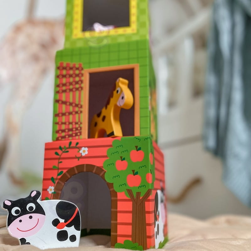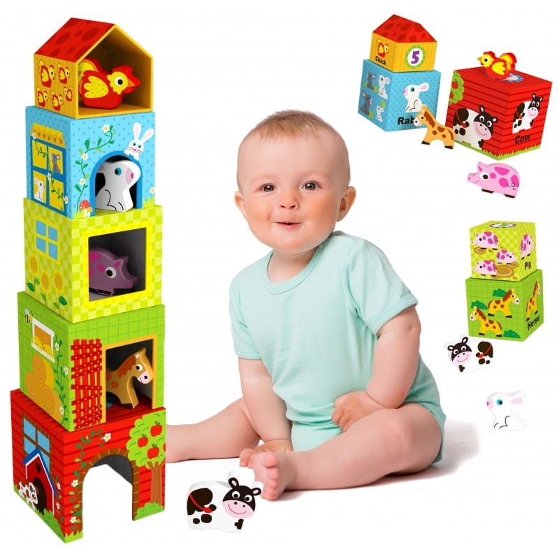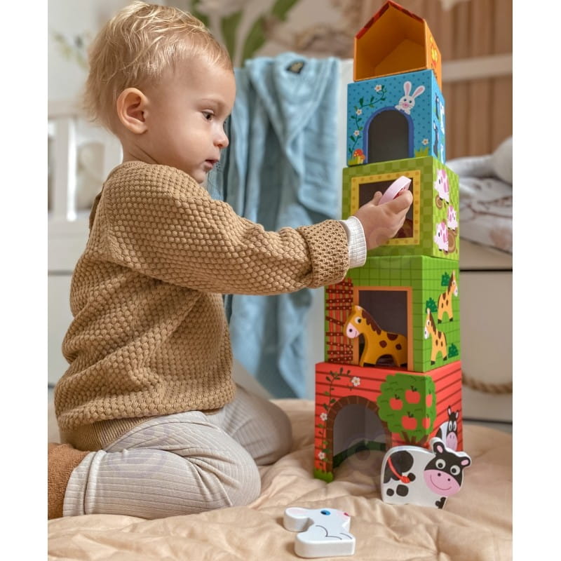 Z tą zabawką dzieci budują wysokie wieże, domki, ustawiają pudełka w rzędzie, wkładają jedno w drugie. Radość przynosi zarówno budowa, jak i przewracanie piramidy. Dzieci uwielbiają wkładać rączki w te okienka, zapoznają się ze zwierzętami, liczbami i wielkościami.