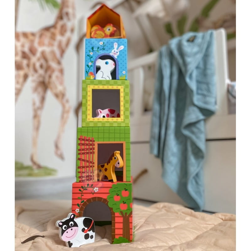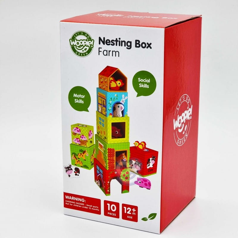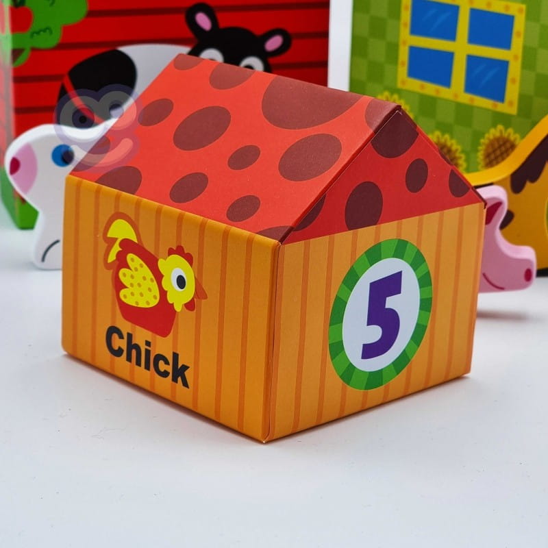 Kolorowe pudełka z otworami, czyli domki dla wiejskich zwierząt, drewnianych figurek krowy, konia, świni, królika i kury. Domki zwierząt Woopie mają cyfry i nazwy w języku angielskim. Kostki są ilustrowane w logiczny sposób rozwijający percepcje dziecka np. na największej umieszczona jest duża krówka i numer 1, a na najmniejszej mała kurka i numer 5.