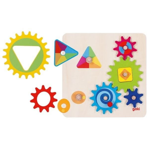 Logiczna układanka, która łączy ze sobą możliwość sortowania kształtów oraz koła zębate. Zębatki o zróżnicowanych kolorach można ułożyć na wiele sposobów, ale dzięki nadrukom producent pokazuje nam jego sposób na ułożenie całości. Na drewnianej planszy namalowana kształty figur do dopasowania. Następnie na każdy kształt należy dopasować koło zębate, które do niego pasuje. Kiedy ułożymy wszystkie elementy wystarczy złapać za czerwony uchwyt i kręcić. Jedno koło wprawi w ruch całą planszę ukazując zasady działania mechaniki i połączeń pomiędzy nimi.