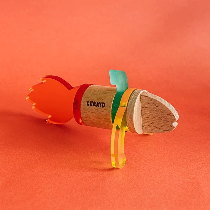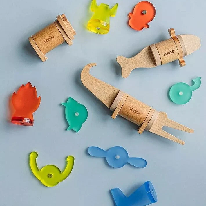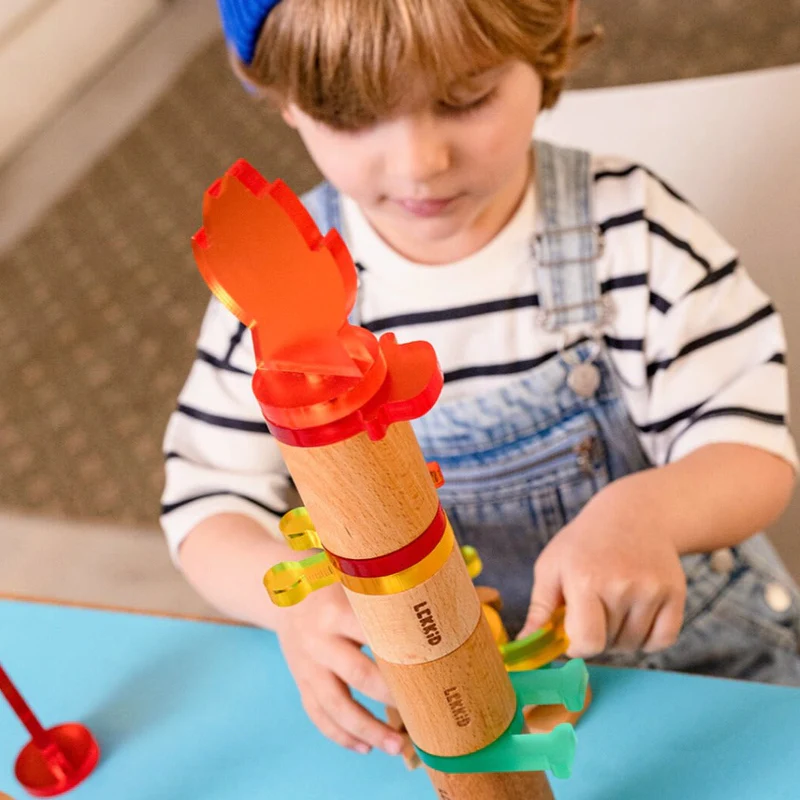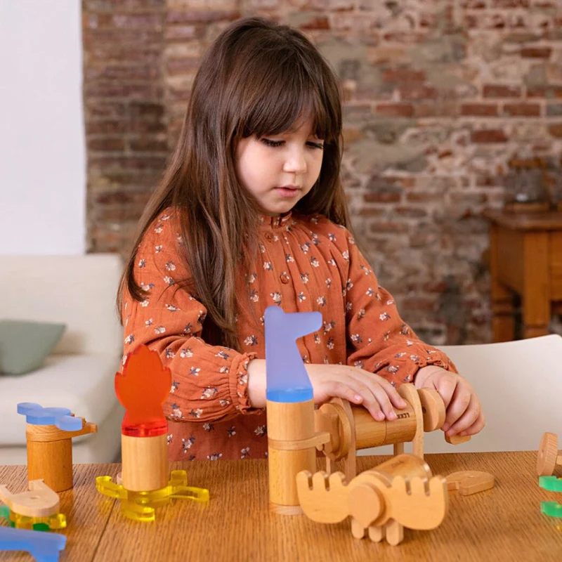 Klocki z najwyższej jakości drewna bukowego i kolorowego, przezroczystego tworzywa zostały opakowane w kartonową tubę, która ułatwi przechowywanie i przenoszenie.