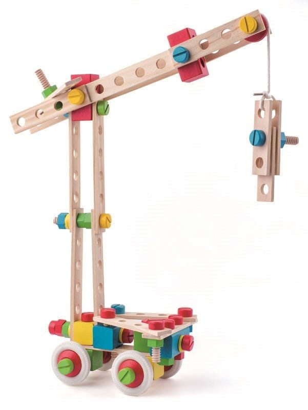 W skład zestawu wchodzą: wkręty, śrubki, kółka, nakrętki, różnej długości listwy z otworami do mocowania, kostki-łączenia oraz śrubokręt, klucz i linka do dźwigu.