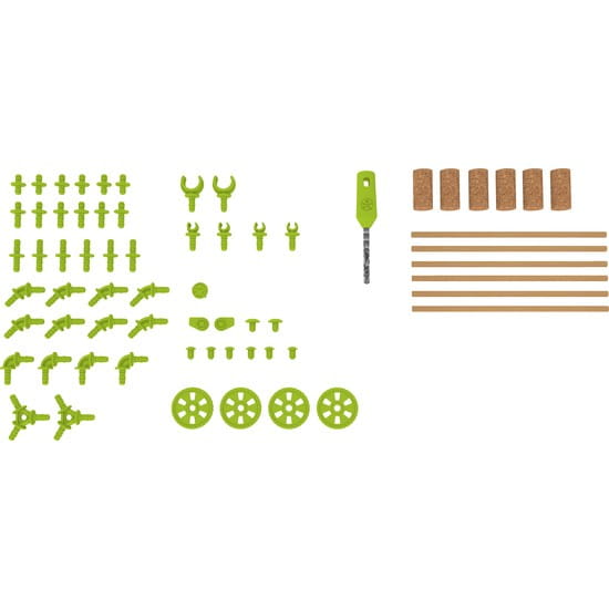 W zestawie: 53 łączniki, sześć okrągłych prętów, sześć korków, wiertło ręczne.
