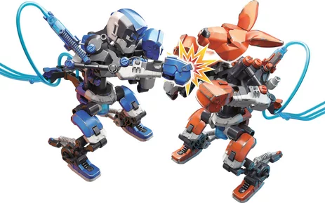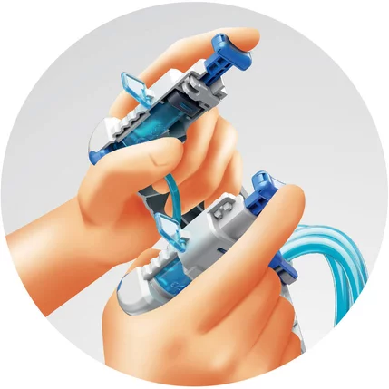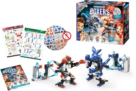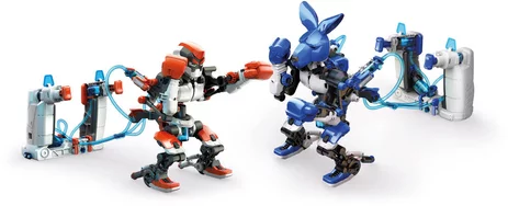 Dwie figurki robotów do samodzielnego zbudowania to propozycja zabawki dla przyszłych inżynierów. Zestaw daje dziecku praktyczne doświadczenie w pracy z energią hydrauliczną i wykorzystanie jej w praktyce. Zawartość opakowania pozwoli na złożenie dwóch figurek wojowników, którymi można sterować za pomocą kontrolerów zasilanych energią hydropneumatyczną (wodą i siłą palców). Po złożeniu powstają dwaj bokserzy, którymi można się bawić z rodzeństwem, rodzicami, kolegą - zadając uderzenia (ruchy bokserów: hak, cios, kontratak i unik) za pomocą padów wyprowadzając ciosy, robiąc uniki i kontrataki.
