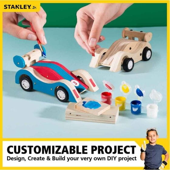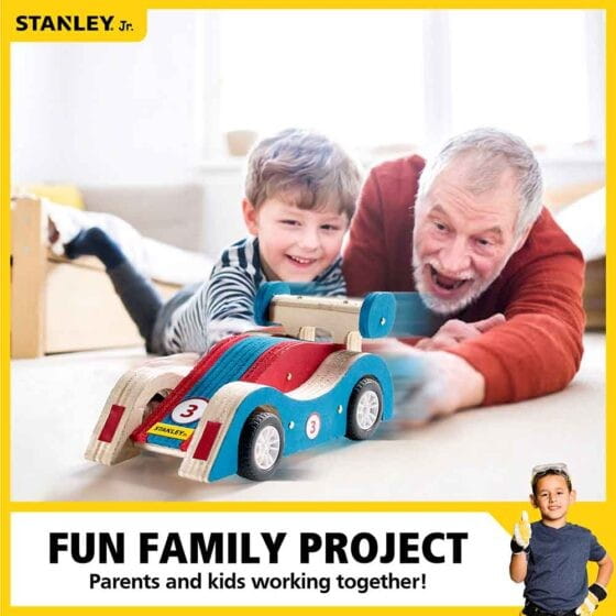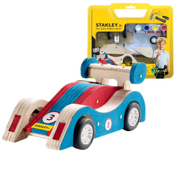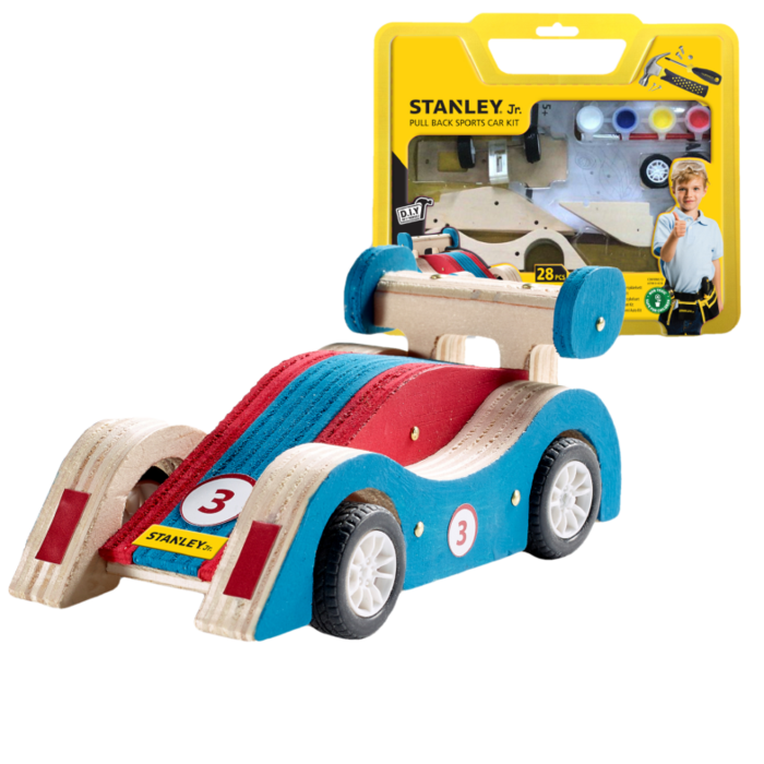 Wyścigówka z napędem do własnoręcznego skonstruowania oraz pomalowania. Zestaw konstrukcyjny Stanley Jr. ze wszystkimi elementami potrzebnymi do zbudowania od podstaw własnej, drewnianej zabawki wyścigowej: odpowiednio wycięte kawałki drewna, plastikowe części samochodu wyścigowego, naklejki oraz śruby i gwoździe. Dzięki użyciu mechanizmu do naciągania, wyścigówka może nabierać prędkość i sunąc po podłodze.