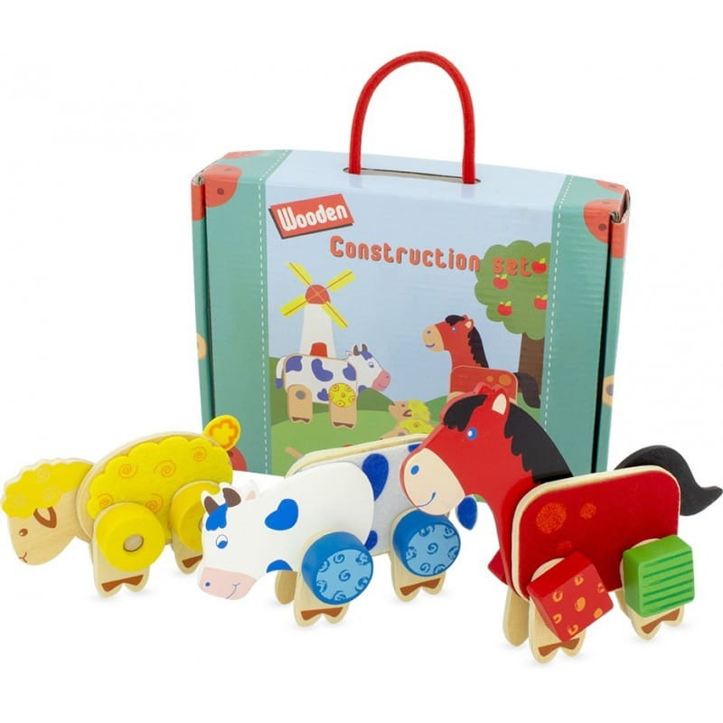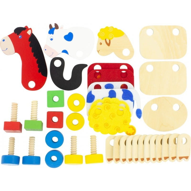 Śruby, nakładki i części do złożenia drewnianych zwierząt: konia ,krowę i owcę. Dzieci mogą dowolnie łączyć elementy, skręcać ze sobą części, tworzyć znane i wymyślne maszyny. Kreatywna zabawka daje wiele możliwości budowania, a przy tym ćwiczy sprawność manualną dziecięcych rączek.