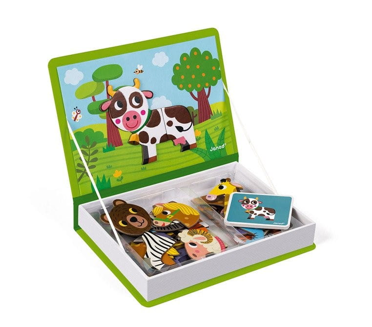 Bestsellerowa układanka magnetyczna Janod to inteligentna zabawa, rozwijająca wyobraźnie, kreatywność, sprawność manualną. Solidne i kolorowe pudełko otwiera się jak książka, można je łatwo transportować, zabrać w podróż, szybko posprzątać, idealnie nadaje się na prezent. Za pomocą kolorowych magnesów układanych na wieczku, dzieci tworzą wiejskie i egzotyczne zwierzęta. Układać można zgodzie z złączonymi wzorami lub wg własnej fantazji.