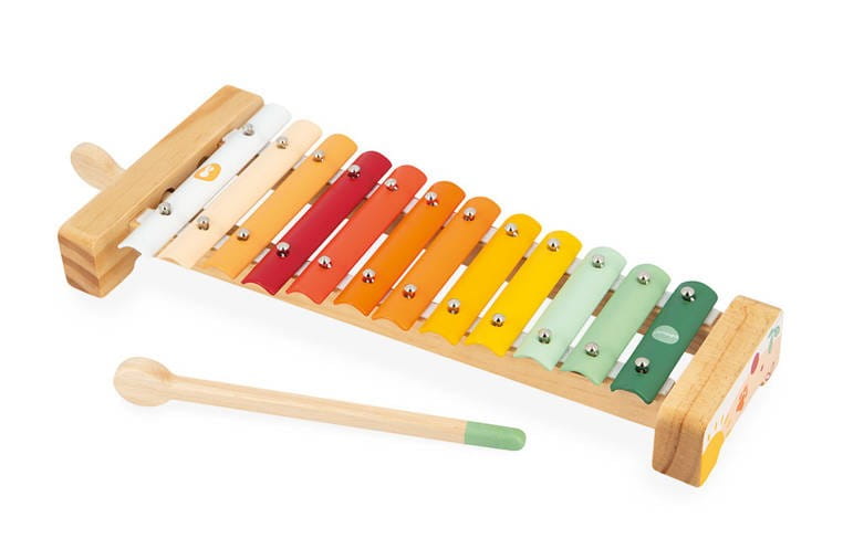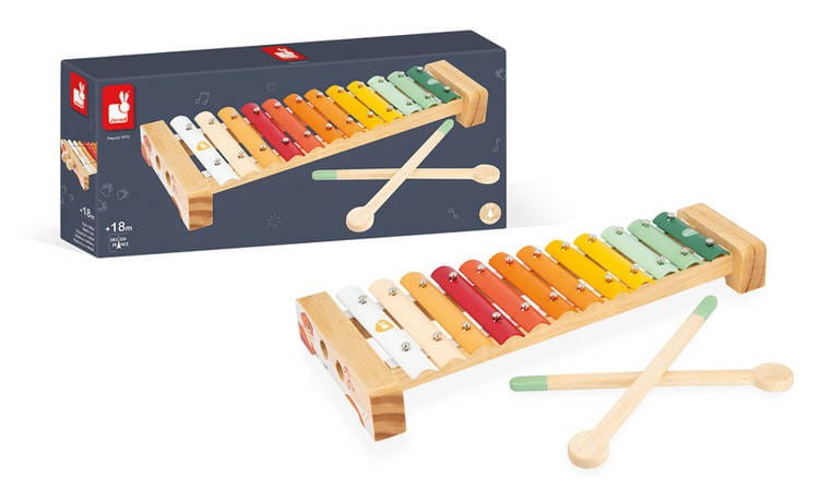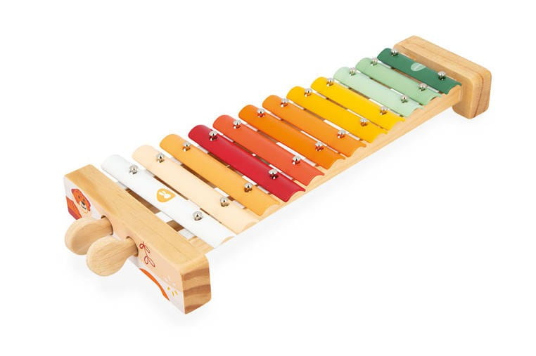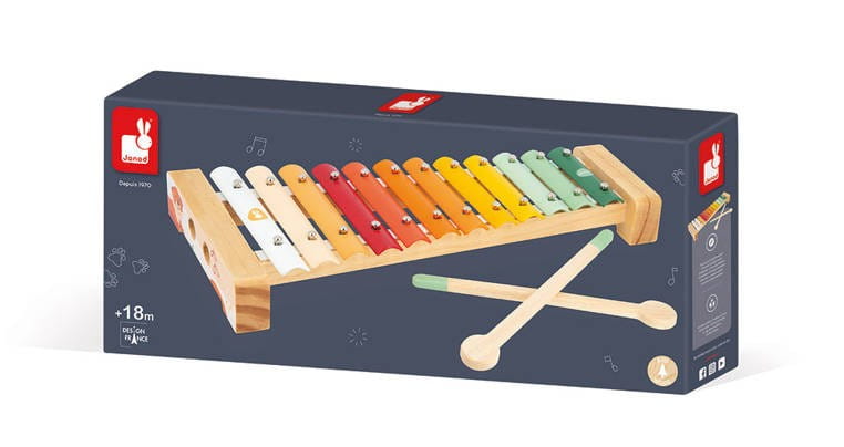Pełne kolorów i radości cymbałki 12 tonowe Janod umożliwiają dzieciom poznanie pierwszych dźwięków, rytmu i dobrego brzmienia. Drewniane pałeczki można wsunąć i przechowywać w podstawie. Metalowe dzwonki brzmią przyjemnie dla ucha, delikatnie, melodyjnie.