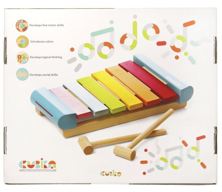 Drewniany Ksylofon Cubika to kolorowy instrument muzyczny dla dzieci już od 18 miesiąca życia. Dzwonki mają ładne delikatne brzmienie, blaszki są z drewna i przytwierdzone do siebie, 2 pałeczki w kształcie młoteczka są drewniane.