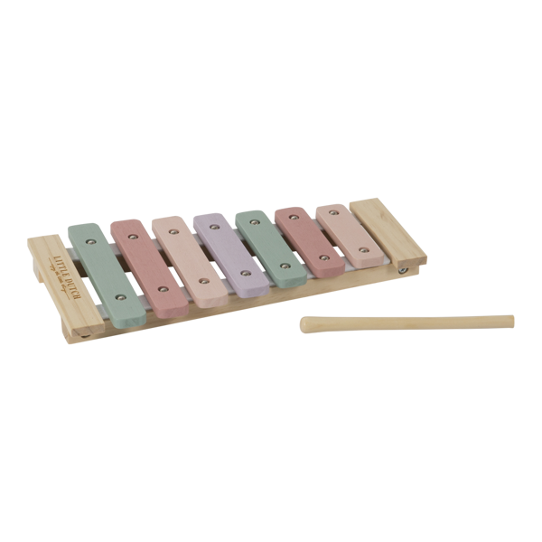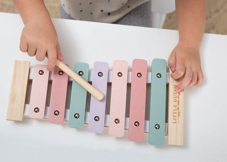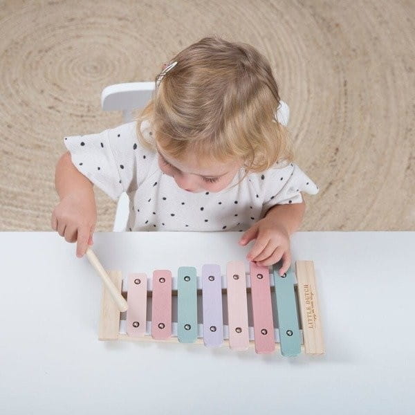Drewniany Ksylofon Little Dutch to kolorowy instrument muzyczny dla dzieci już od 18 miesiąca życia. Dzwonki mają ładne delikatne brzmienie, blaszki są z drewna i przytwierdzone do siebie, pałeczka do grania z drewna. Cymbałki dziecięce wydają delikatny dźwięk, posiadają 7 stopniową skalę dźwięk