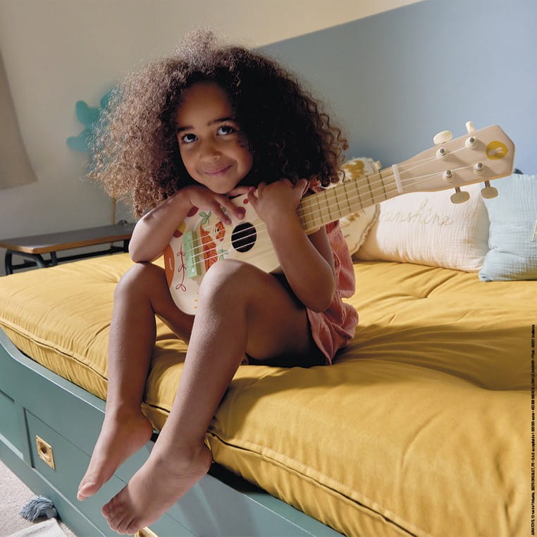 Drewniana gitara Janod dla małych artystów muzyków do grania i śpiewania oraz zabawy i odkrywania rytmów. Wielkość i kształt idealnie pasują do dziecięcych rączek. Drewniana gitara ma 4 struny, pokrętła do regulacji ich napięcia, poręczny rozmiar i piękną słoneczną kolorystykę . Ten instrument muzyczny wprowadza w świat dźwięków, rytmów, może przyczyni się do odkrycia wielkiego talentu? Gitara dziecięca stanowi subtelną dekorację dziecięcego pokoiku.