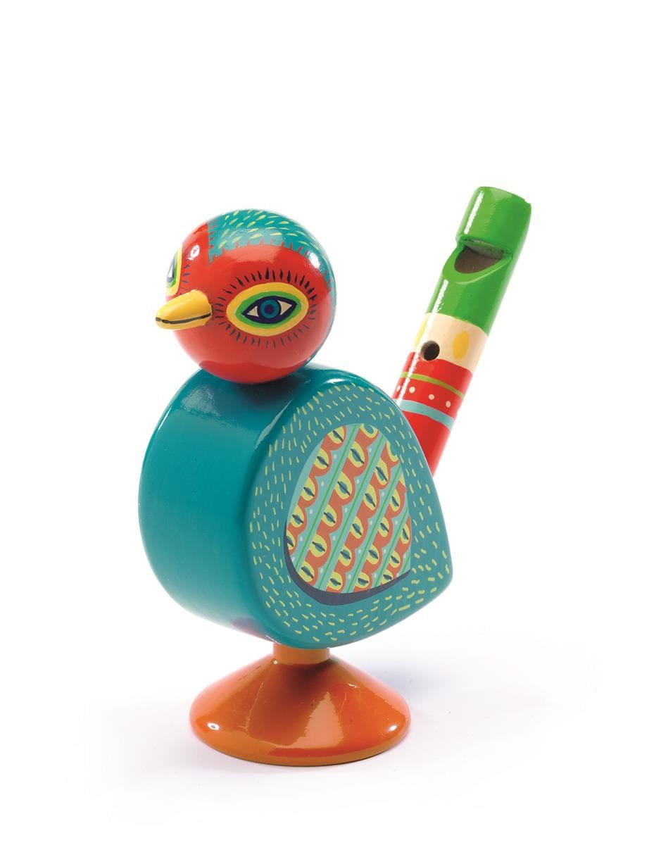 Drewniany instrument gwizdek Djeco z serii Animambo, czyli fantastycznych, kolorowych i cudownie brzmiących rekwizytów. Należy dmuchnąć w otwór drewnianego gwizdka na ogonie, aby wydobył się dźwięk. Ptaszek samodzielnie stoi stanowiąc ciekawa ozdobę dziecięcego pokoiku, a gwizdanie to także dobre ćwiczenie logopedyczne dla dzieci.