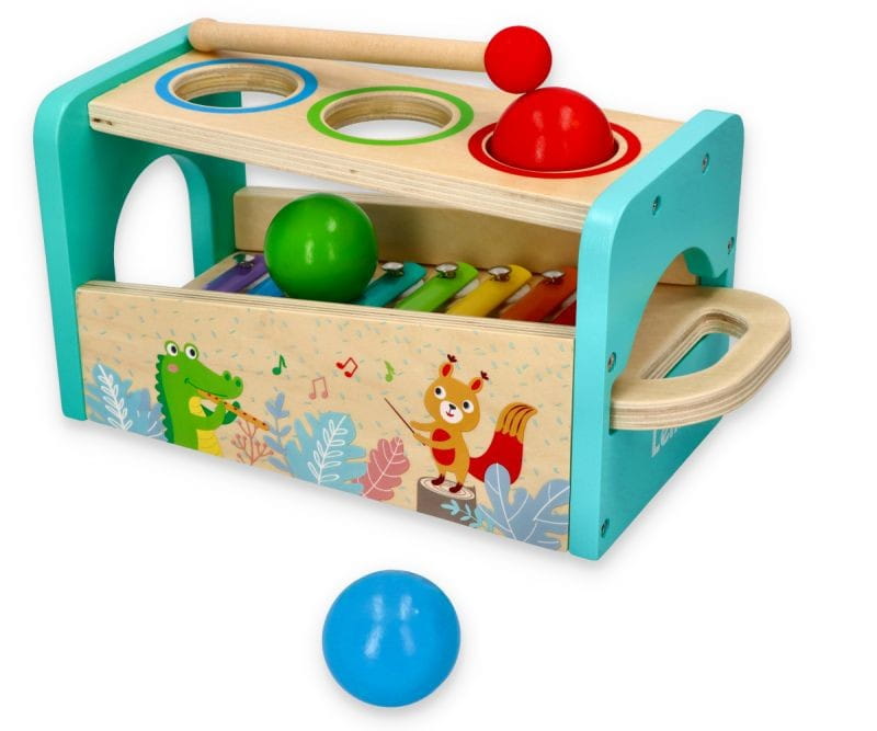 Drewniana przybijanka jest ozdobiona motywem leśnym, opakowana w eleganckie pudełko - stanowi udany prezent na roczek oraz inne okazje. Zabawka, która się nie nudzi, a pomaga rozwijać słuch, poczucie rytmu, wspiera rozwój wyobraźni, koncentracji i koordynacji ruchowej.