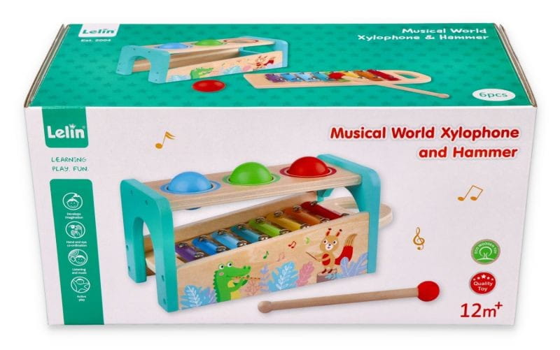 Jedna zabawka mieści w sobie tak wiele możliwości zabawy i rozwoju dzieci w wieku roczek i starszych. Drewniana ławeczka Lelin ma 2 poziomy zabawy, to kulodrom z 3 drewnianymi kulkami i młotkiem, cymbałki i sorter kolorów w jednym.