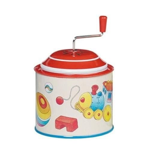 Zabawka dzieciństwa w pięknym wydaniu graficznym - zabawki dzieciństwa. Z metalowej katarynki wydobywają się różne odgłosy, a szybkość kręcenia decyduje o prędkości ich brzmienia.