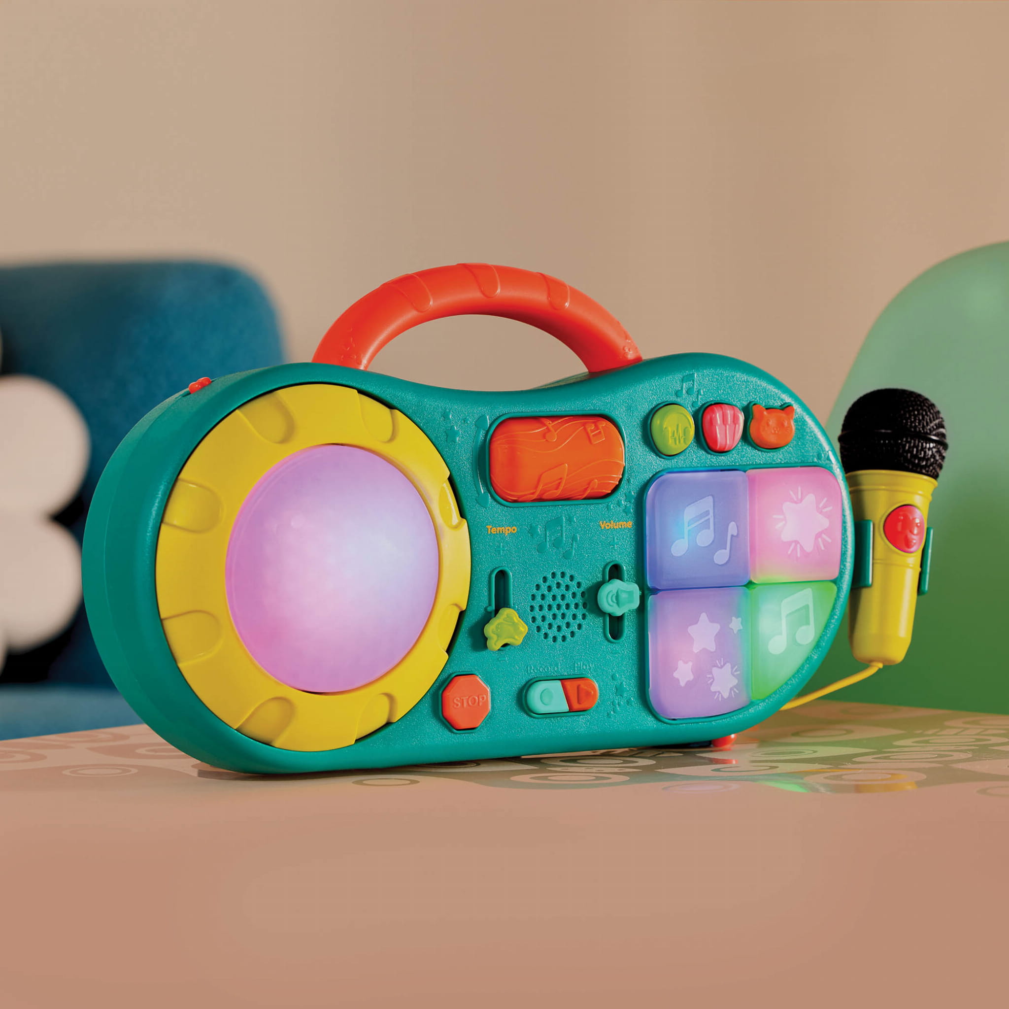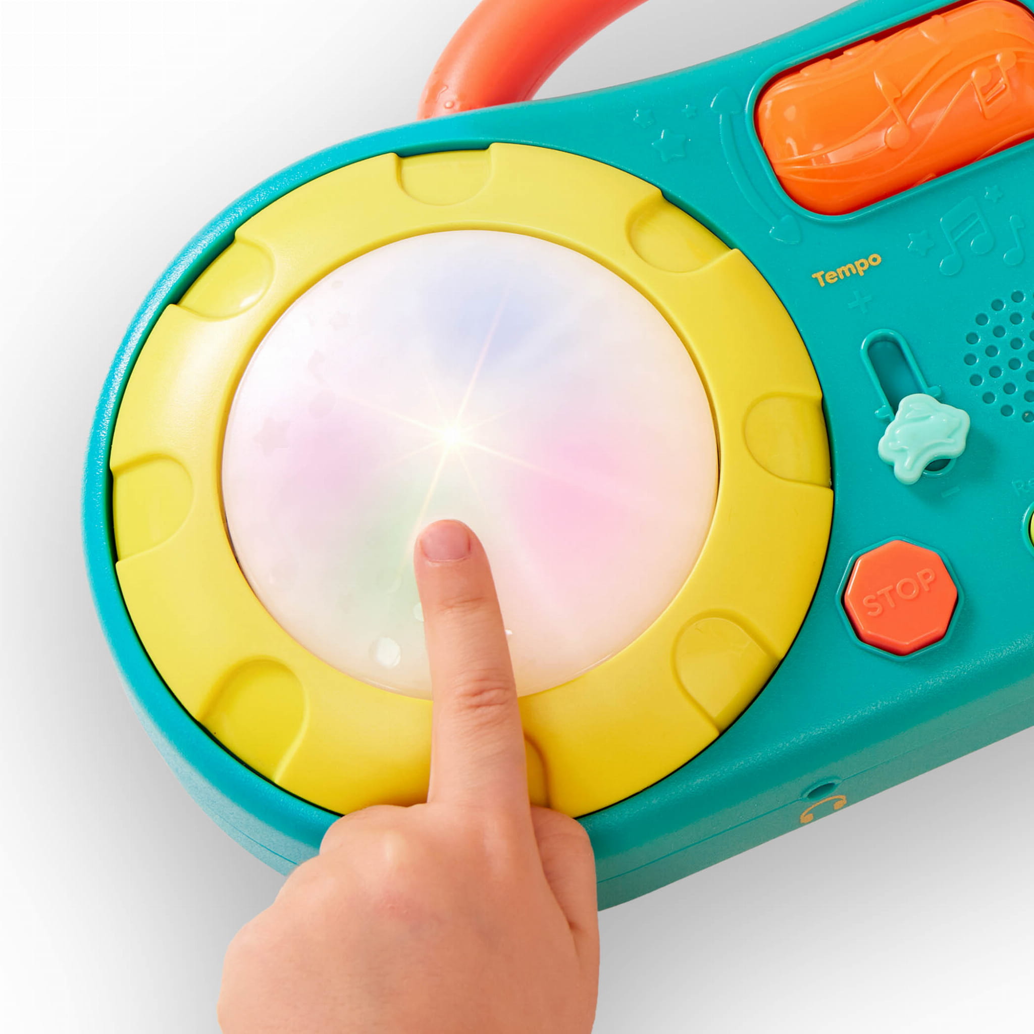 Możesz również nałożyć własny rytm, korzystając z podświetlanego padu bębnowego lub dodać 12 zabawnych dźwięków za pomocą przycisków SFX – efekty specjalne (!).