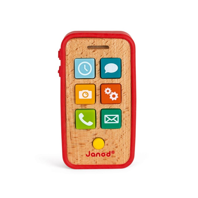 Dzieci uczą się przez naśladowania dorosłych, a najczęściej widzą nas podczas rozmów telefonicznych. Teraz mogą bawić się bezpiecznym, pierwszym telefonem Janod. Ten drewniany aparat nie wydaje piskliwych melodyjek, nie emituje szkodliwego promieniowania, nie włączysz na nim bajki. Mimo to dzieci go uwielbiają za kolorowe przyciski, które wydają przyjemne dźwięki: klik aparatu, alarm budzika, sygnał wiadomości e-mail, ustawienia, dzwonek telefonu, sms oraz powrót do ekrany głównego. Dziecięcy smartfon Janod ma silikonową obudowę z miejscem z tyłu na kamerę. Przy okazji dziecko poznaje kolory, jest stymulowane do wypowiadania pierwszych słów: halo mama, tata, dom, papa, miau miau itp.