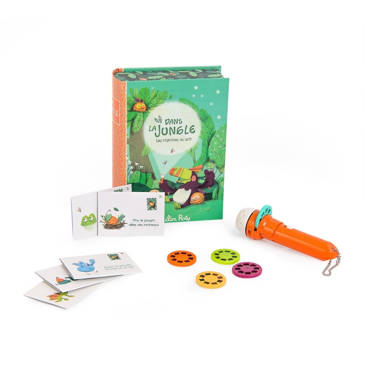 Piękne pudełko w kształcie książki zamykanej magnetycznie, a w niej kino domowe, czyli projektor do wyświetlania historii obrazkowych i aż 5 krążków z ilustrowanymi opowieściami oraz zaproszenia z kopertami na seans. Historyjki opowiadają o różnych przygodach zwierzątek w dżungli.