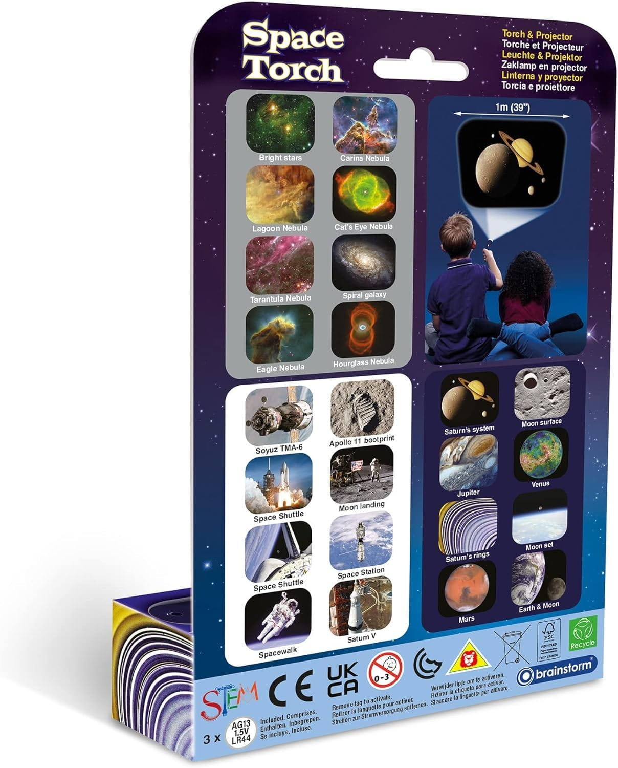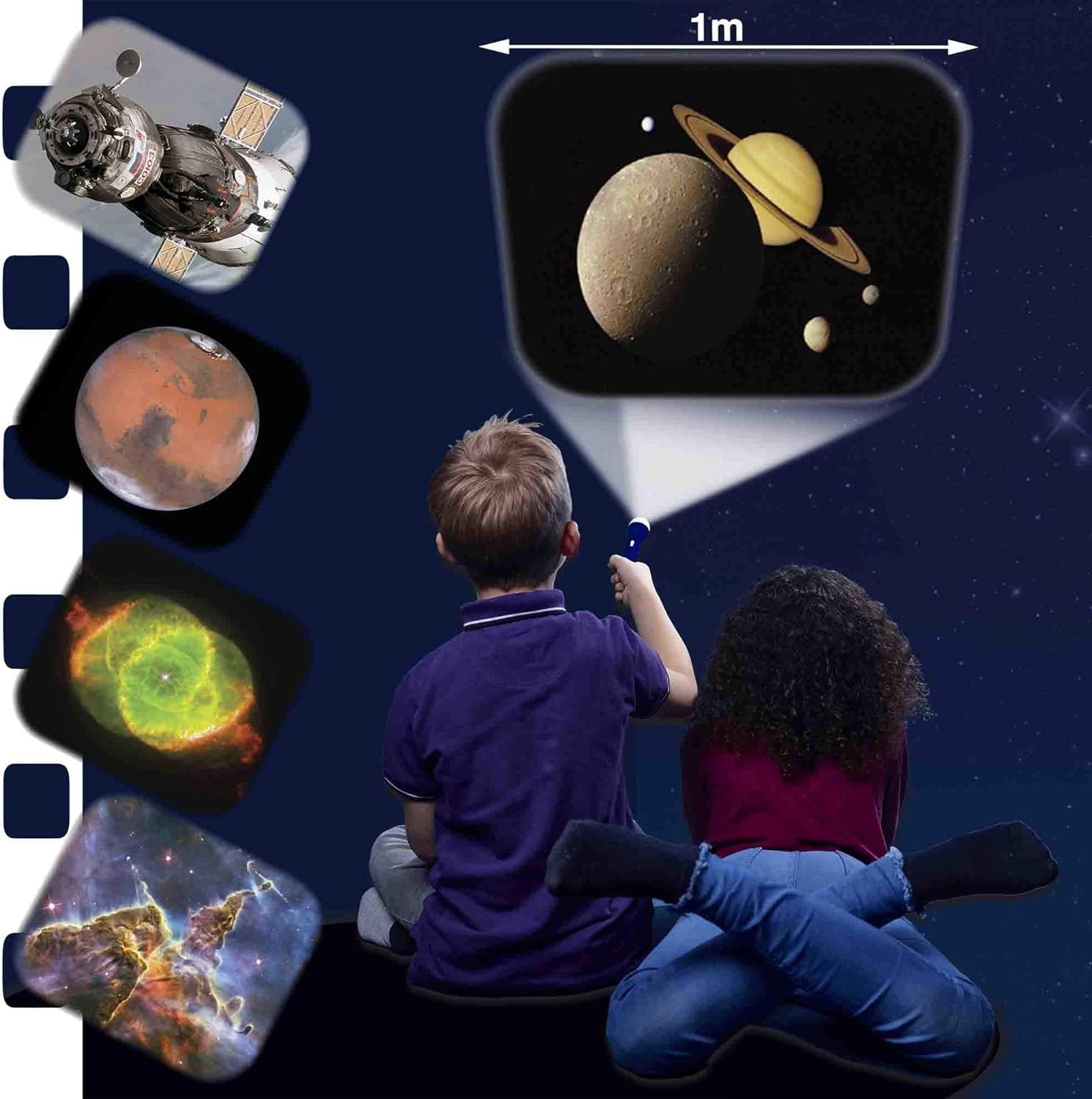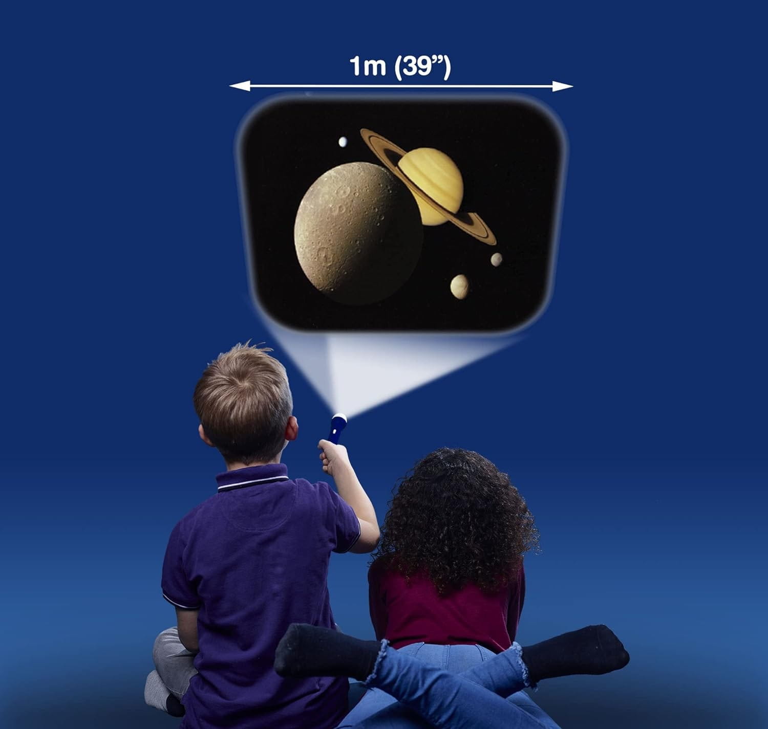 Mały projektor dla dzieci umożliwia wyświetlanie slajdów - 24 zdjęcia NASA i Teleskopu Hubble'a, przedstawiające astronautów, promy kosmiczne, planety i mgławice. Wystarczy zgasić światło i włączyć jednym guzikiem projektor. W zestawie mamy 3 krążki.