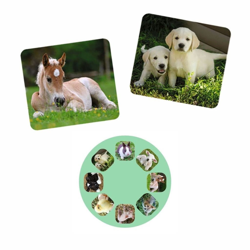 Mały projektor dla dzieci umożliwia wyświetlanie slajdów z młodymi zwierzętami na ścianie lub suficie. Wystarczy zgasić światło i włączyć jednym guzikiem projektor. W zestawie mamy 3 krążki, razem 24 obrazy na slajdach z różnymi zwierzątkami.
