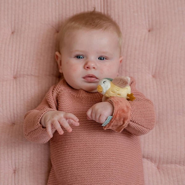 Grzechotka na rączkę Little Dutch jest mięciutka, sensoryczna, aktywizuje, bardzo interesuje małe dzieci. Bransoletka niemowlęca jest zapinana na rzep, a pluszowa mewa przyjemnie grzechocze. Miękka grzechotka może być założona na rącze lub nóżkę niemowlęcia, zachęcając go do ruchu i potrząsania. Grzechotka na rączkę ma bardzo mięciutki pasek oraz wystające metki do badania paluszkami, ciągnięcia, próbowania.