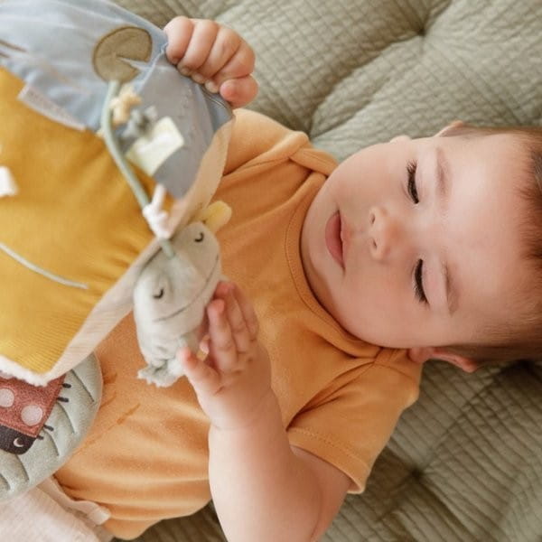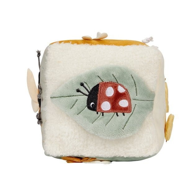 Miękka kostka edukacyjna Little Dutch jest pełna atrakcji dla maluszka. Kostka sensoryczna z łąkowymi zwierzętami zawiera wiele form i faktur, które stymulują zmysły niemowląt. Maluszek może obracać i bawić się 6 ściankami, na których jest tak wiele do odkrycia, w tym bezpieczne lustereczko, chowająca się żabka, szeleszczące listki, a potrząsana kostka wydaje odgłosy.