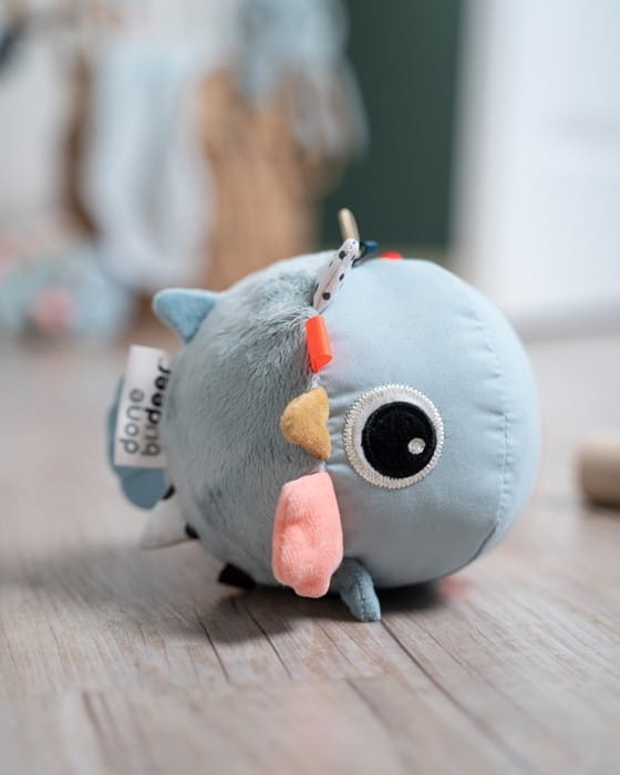 Sensoryczna piłeczka Done by Deer jest pełna elementów, które zaciekawią małe paluszki. Chwytaj za miękkie "kolce" i płetwy rybki Puffee oraz nasłuchuj ekscytujących i szeleszczących dźwięków. Poczuj różne tekstury i odkryj kolorowe metki.