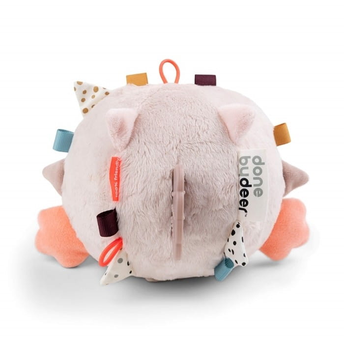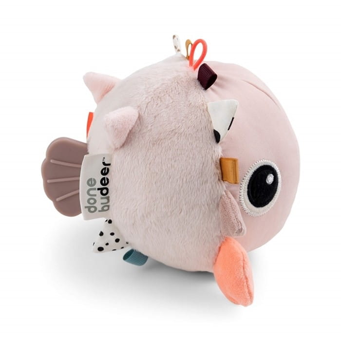 Sensoryczna piłeczka Done by Deer jest pełna elementów, które zaciekawią małe paluszki. Chwytaj za miękkie "kolce" i płetwy rybki Puffee oraz nasłuchuj ekscytujących i szeleszczących dźwięków. Poczuj różne tekstury i odkryj kolorowe metki.
