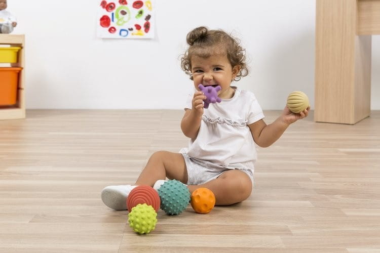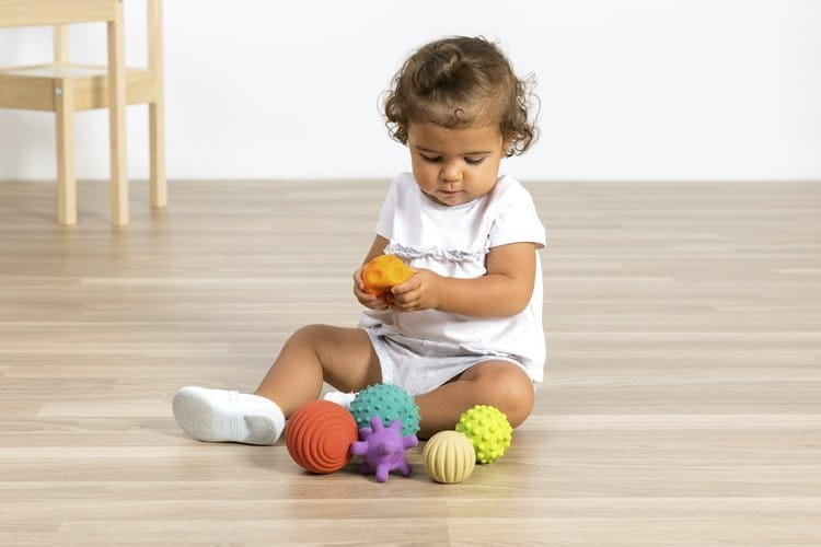 - Piłeczki Miniland zapewniają właściwe wrażenia dotykowe, pobudzają receptory na skórze dzięki zastosowanym strukturom: wypustki, odnóżki, wgłębienia, kolce, linie.