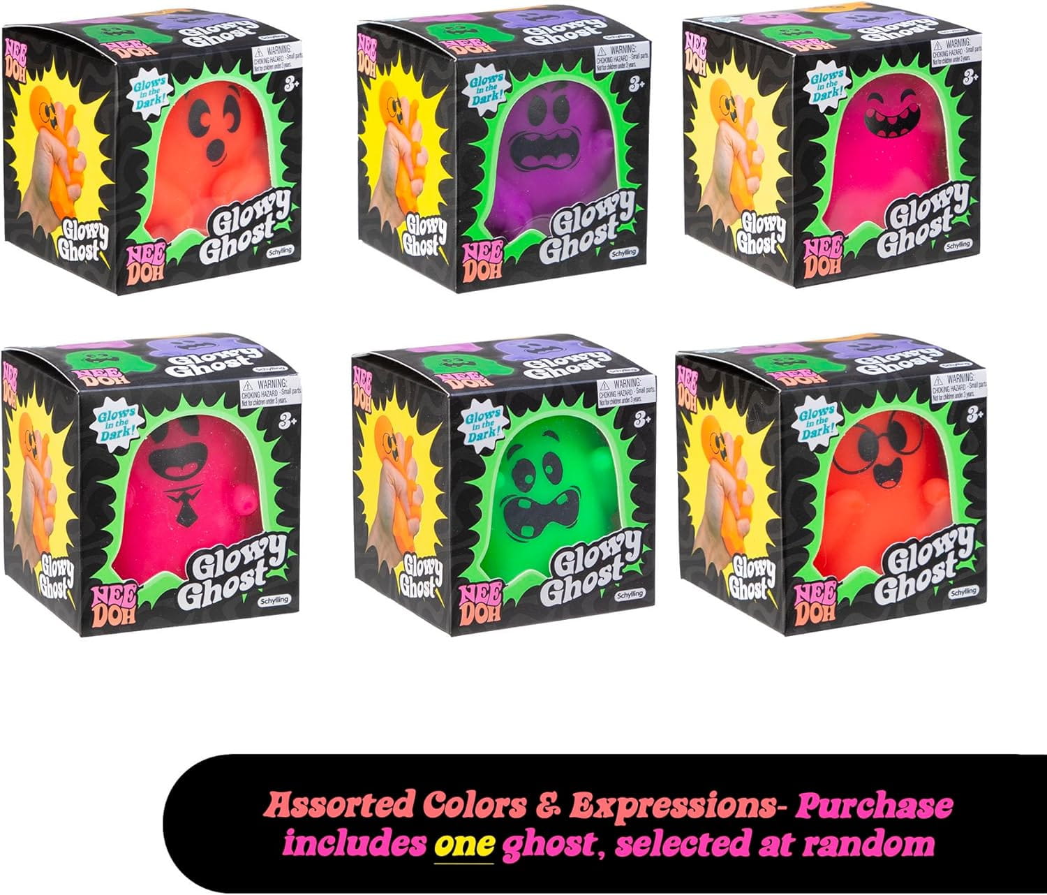 NeeDoh Groovy Ghost to świecąca w ciemności zabawka fidget (mały gadżet przeznaczony do manipulowania w rękach) do ściskania, rozciągania, głaskania, podrzucania i zgniatania, aby bawić się i wyciszyć, odstresować. Te urocze duszki delikatnie świecą w ciemności, co pozwala na obserwowanie ich zaskakujących min w po ciemku. Groovy Ghost dostępny jest w czterech żywych kolorach i sześciu różnorodnych stylach, co sprawia, że każdy egzemplarz jest unikalny.