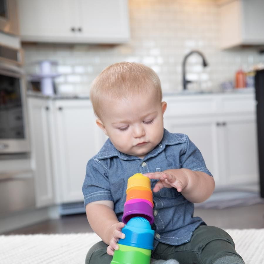 Wszechstronna zabawka rozwojowa, innowacyjna wieża Dimpl Stack do układania wieży, wkładania jeden w drugi, wciskania silikonowych bąbelków, dotykania sensorycznych faktur, przewracania, turlania, a nawet zabrania do kąpieli. Małe paluszki uwielbiaj wciskać bąbelki o różnych fakturach i kolorach, a później próbować ustawiać stosiki z kolorowych kubeczków.