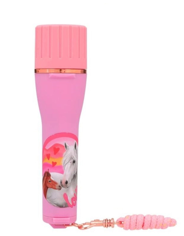 Różowa Latarka z galopującymi końmi, metalowymi detalami, zawieszką z linką i i praktyczną funkcją wyłączania (latarka wyłącza się automatycznie po 10 minutach). Latarka Miss Melody ma ergonomiczny kształt, ma podpórkę, jest lekka. W zestawie 2 baterie AA, wymienne.