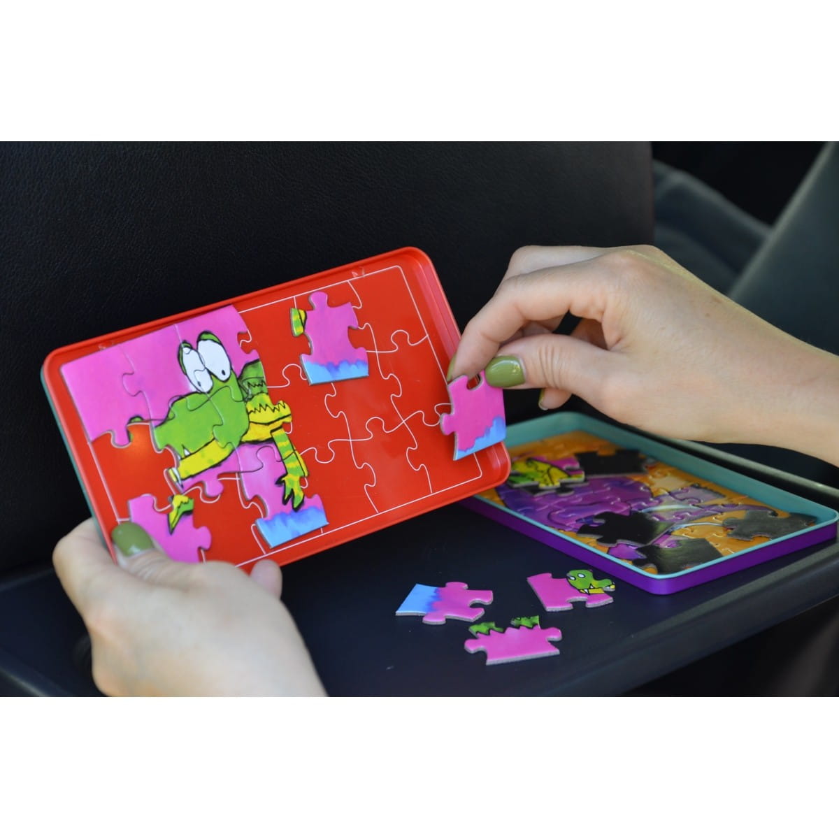 Układanka magnetyczna w metalowym pudełku, które jest zarazem planszą do układania magnetycznych puzzli, w sam raz do zabrania wszędzie ze sobą. Magnesy dobrze trzymają się puszki i nie straszne im żadne. W metalowym pudełku znajdują się2 obrazki do ułożenia : aligator składający się z 18 elementów oraz słoń składający się z 28 puzzli.