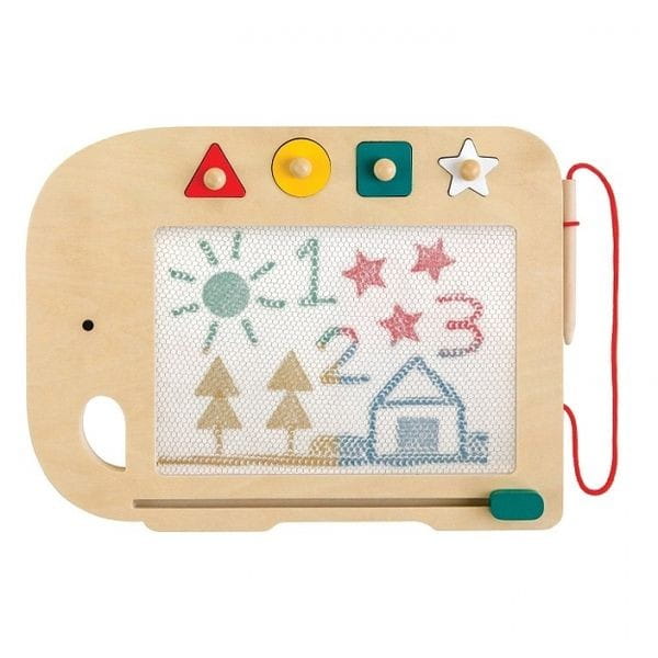 Drewniana tablica do pisania, rysowania i robienia stempelków, czyli magnetyczny znikopis z pieczątkami Petit Collage. Kreatywna i edukacyjna tablica ma w drewnianej ramie 4 stempelki" trójkąt, koło, kwadrat i gwiazdkę. Dzieci poznają figury geometryczne i kolory, mogą odcisnąć ślad na tablicy, a następnie domalować coś za pomocą magnetycznego długopisu. Drewniany wskaźnik jest przyczepiony sznureczkiem do ramy, dzięki temu nie zgubi się. Aby zmazać obrazek wysączy przeciągnąć drewniany bolec.