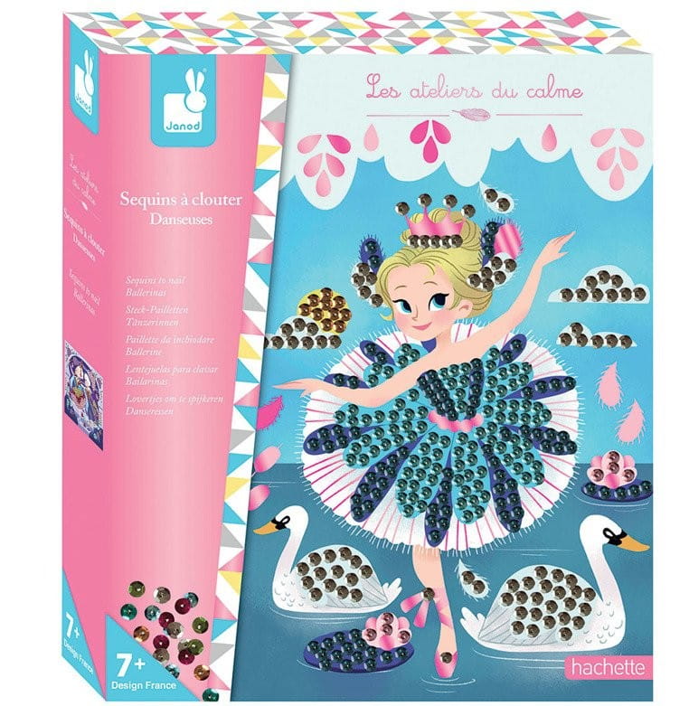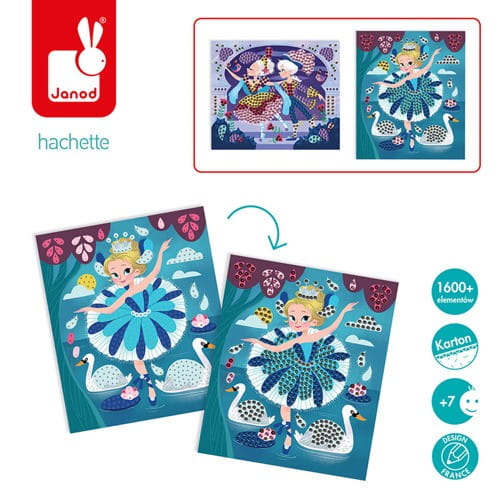 Artystyczny zestaw Janod polega na ozdabianiu 2 kart z obrazkami tancerek przy pomocy załączonych cekinów oraz szpileczek (gwoździki). Błyszczące elementy ślicznie się mienią, co daje spektakularny efekt końcowy. Zestaw do dekorowania obrazków zawiera 800 cekinów w 7 kolorach, które można umieszczać w dowolnych miejscach. Na obrazkach są już zrobione dziureczki, które ułatwiają wbicie gwoździka. Od spodu umieszcza się piankową podkładkę - tworząc tym samym niezwykły obraz.