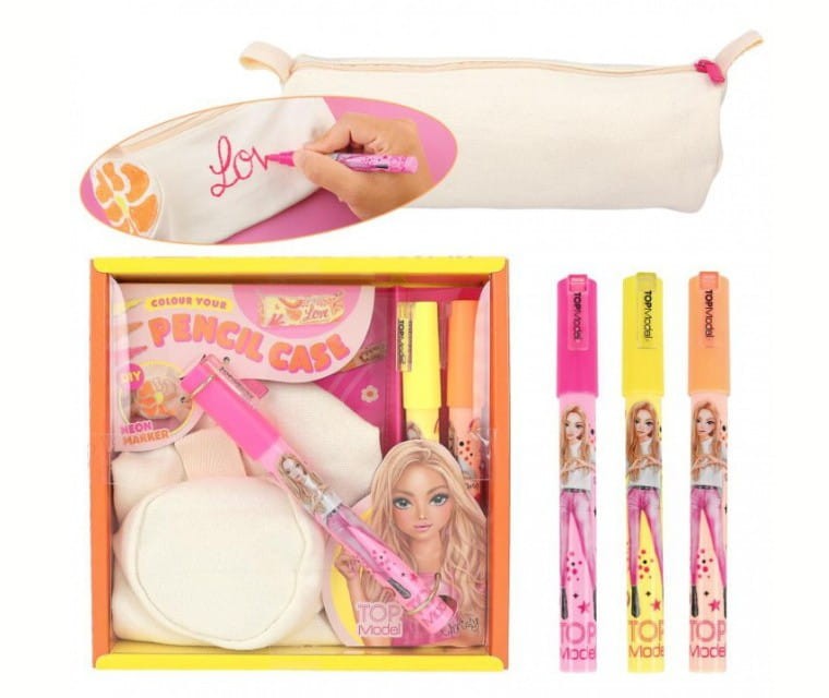 TOPModel Colour your Pencil Case to zestaw do samodzielnego dekorowania piórnika, zawierający trzy fluorescencyjne markery (różowy, pomarańczowy, żółty) i piórnik z beżowej bawełny do kreatywnego malowania. Zestaw przeznaczony jest dla dzieci od 6 roku życia i zawiera instrukcję, która pokazuje, jak ozdobić piórnik.