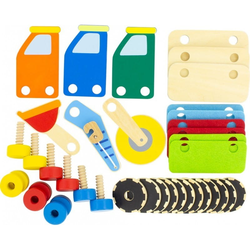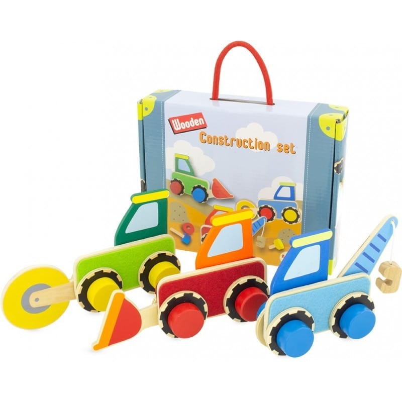 Śruby, nakładki, koła, części pojazdów to zestaw 39 części do skonstruowania drewnianych maszyn budowlanych: dźwig, koparka, walec. Dzieci mogą dowolnie łączyć elementy, skręcać ze sobą części, tworzyć znane i wymyślne maszyny. Kreatywna zabawka daje wiele możliwości budowania, a przy tym ćwiczy sprawność manualną dziecięcych rączek.